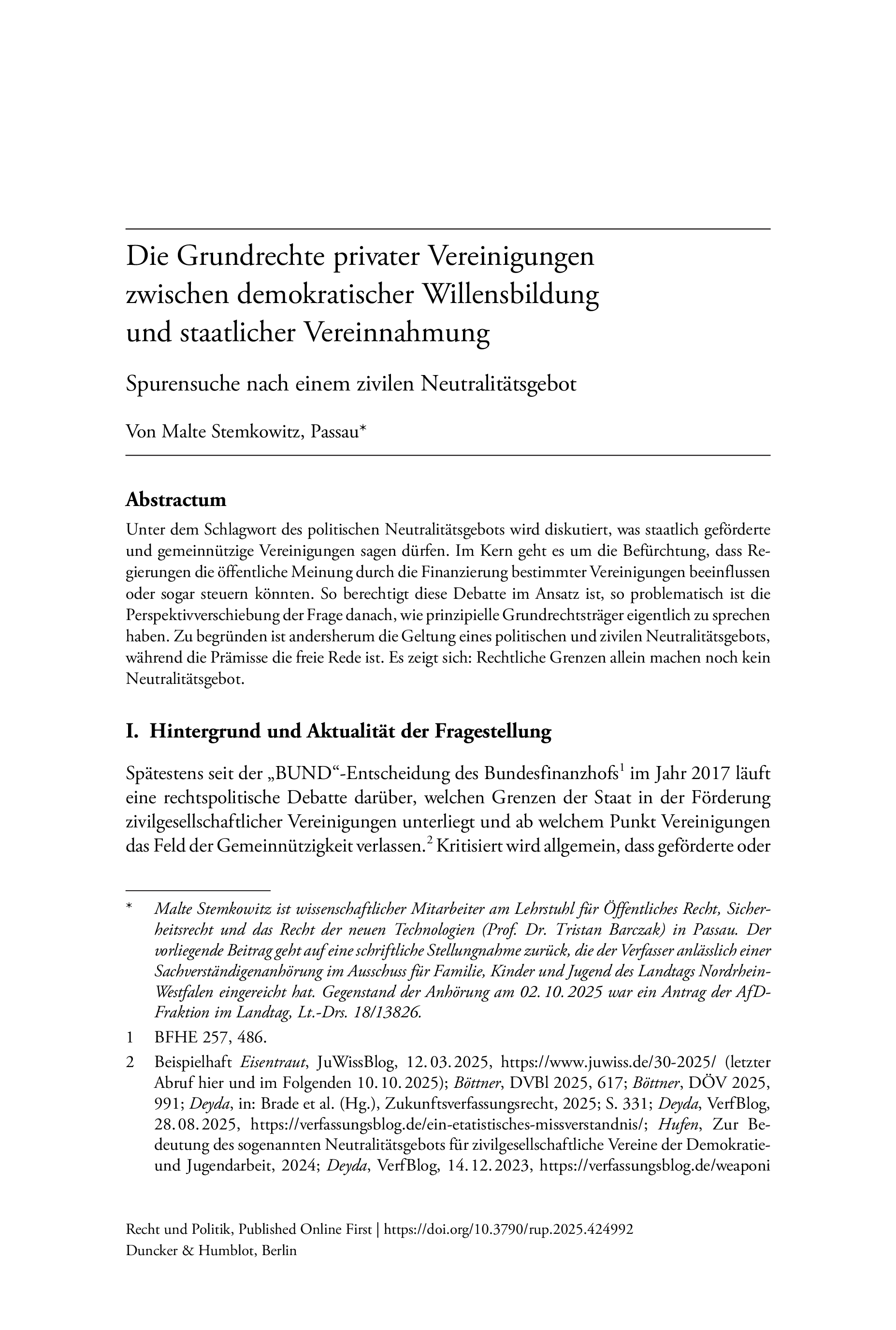 Spurensuche nach einem zivilen NeutralitätsgebotRecht und Politik, Online First | First published online: December 18, 2025