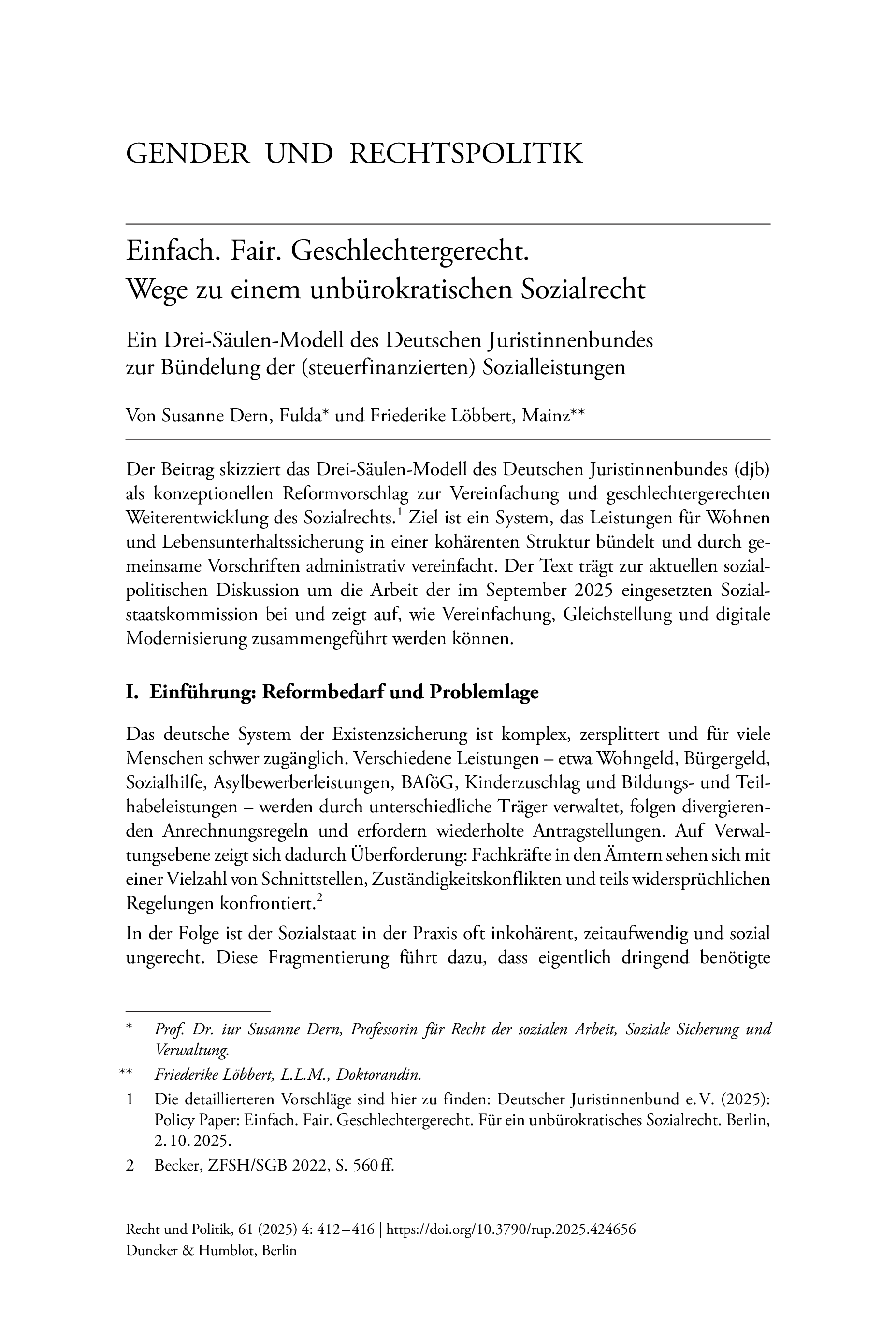 Ein Drei-Säulen-Modell des Deutschen Juristinnenbundes zur Bündelung der (steuerfinanzierten) SozialleistungenRecht und Politik, Vol. 61 (2025), Iss. 4 : pp. 412–416 | First published online: December 15, 2025