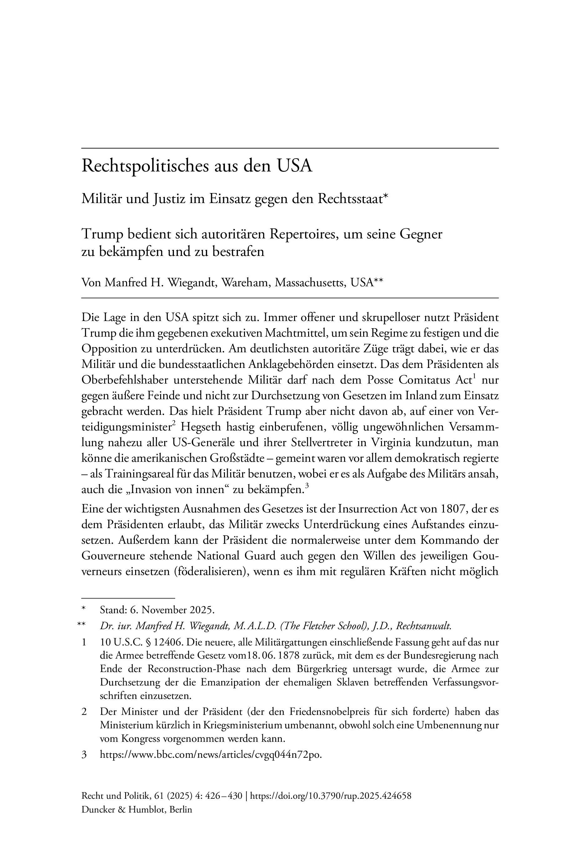 Militär und Justiz im Einsatz gegen den Rechtsstaat Trump bedient sich autoritären Repertoires, um seine Gegner zu bekämpfen und zu bestrafenRecht und Politik, Vol. 61 (2025), Iss. 4 : pp. 426–430 | First published online: December 15, 2025